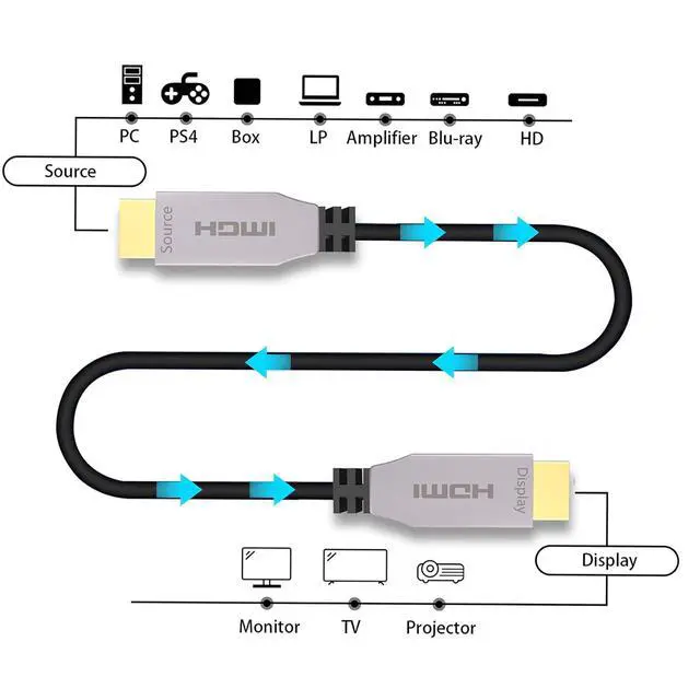 ONE-WAY TRANSMISSIONFiber HDMI cable must be installed in the correct direction, Source Plug connect source devices such as Blu-ray players,PS3/PS4/PS5 etc.And Display Plug connect display decices such as Moniter,Projector,TV etc.Plug and Play Ready,no external power needed.