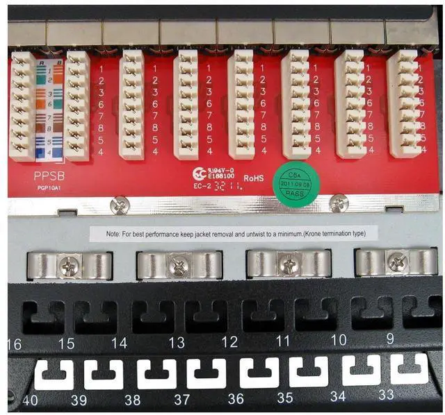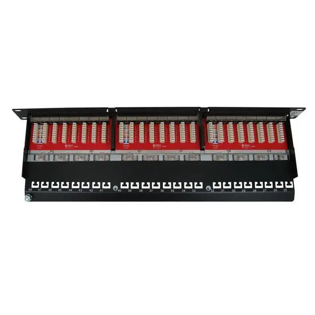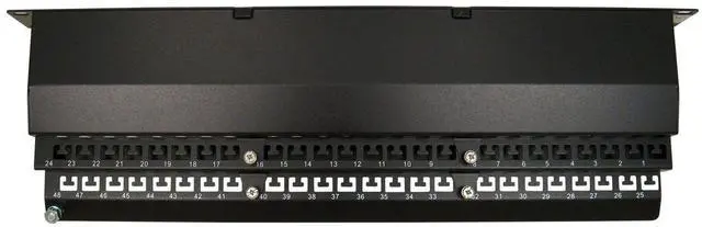 This product is a 48 port shielded 19" horizontal rackmount 1U cat6A Krone type patch panel. At the front it is number labeled for easy identification. Jack connectors are gold plated to 50 micron thickness and the minimum operating life of jack connectors is 750 insertions. The minimum operating life of the Krone type IDC connectors is 250 terminations and they are compatible with 22 to 26 awg solid wires. Brand for this product is Vertical Cable.