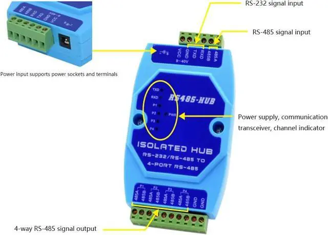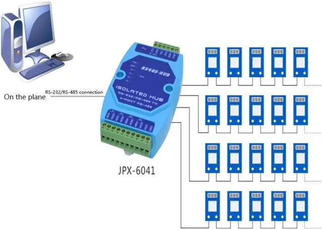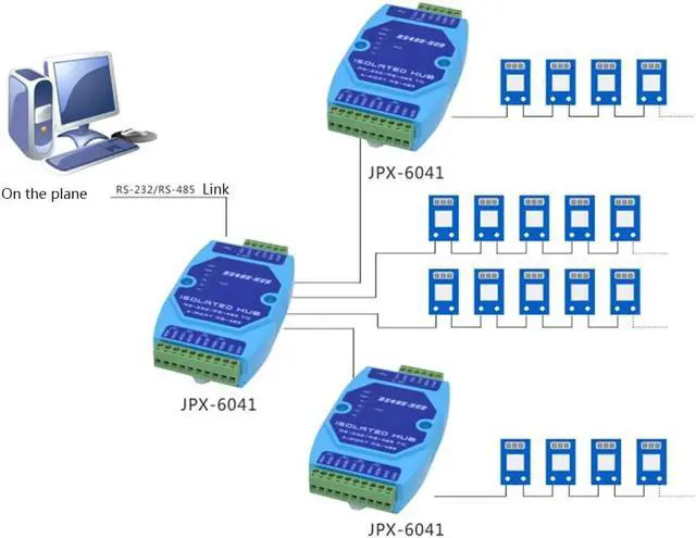 RS-485 bus splitter hub (HUB) designed for industrial automation communication, solving RS-485 bus star structure networking and solving RS-485 large system requirements in complex electromagnetic field environment. Support The transmission rate is up to 115.2 Kbps, the RS-485 interface uses opto-isolation technology, 600W lightning surge protection circuit, providing 1000V isolation voltage can effectively suppress The lightning protection and ESD protection RS-485 working mode adopts the discriminating circuit to automatically sense the data flow direction, and automatically switch the enabling control circuit to easily solve the RS-485 transceiving conversion delay problem. The RS-485 interface transmission distance is greater than 3000 meters. Stable performance. Widely used in highway toll collection systems, road monitoring systems and power collection systems, it is a data interface conversion product with excellent performance and excellent price.