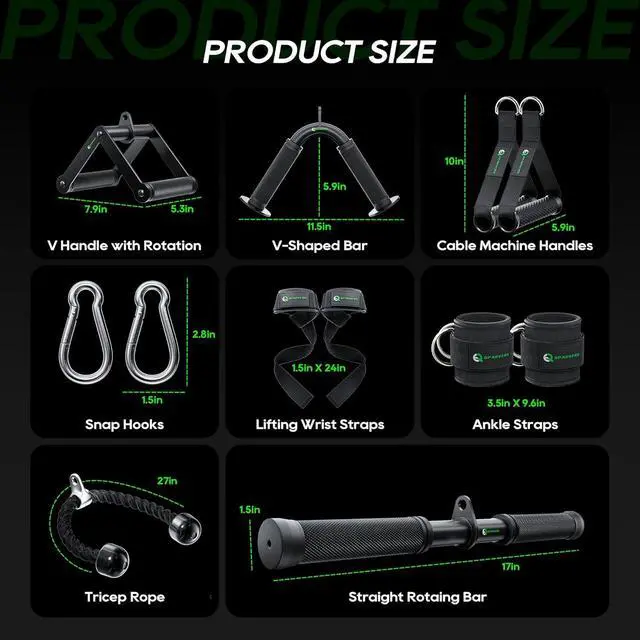Package Includes - 1 * V-Shaped Bar +1 * Straight Rotaing Bar + 1 * V Handle with Rotation + 1* Nylon Braided Tricep Rope+2 *Ankle Straps+ 2*Cable Machine Handles+ 2*Snap Hooks+ 2*Lifting Wrist Straps.
