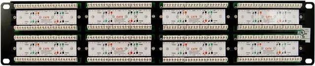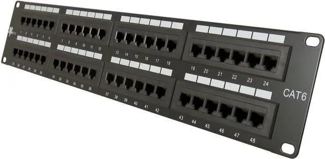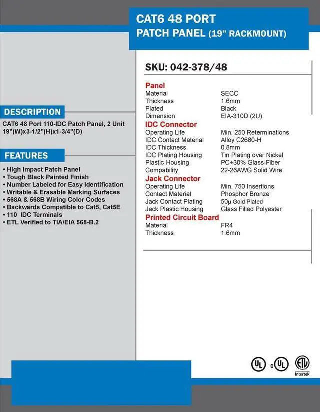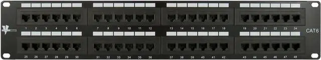 This product is a 48 port 19" horizontal rackmount 2U cat6 patch panel. At the front it is number labeled for easy identification and has writable and erasable marking surfaces. Jack connectors are gold plated to 50 micron thickness and the minimum operating life of jack connectors is 750 insertions. The minimum operating life of the 110 IDC connectors is 250 terminations and they are compatible with 22 to 26 awg solid wires. Brand for this product is Vertical Cable.