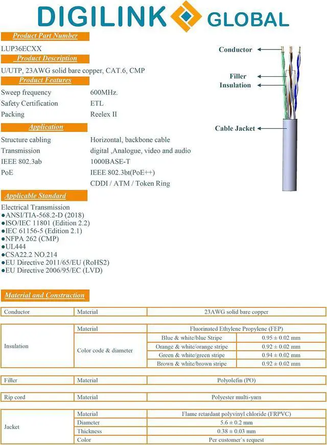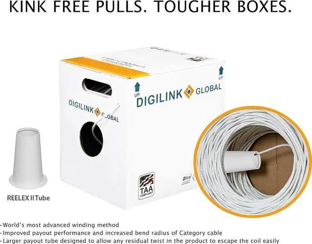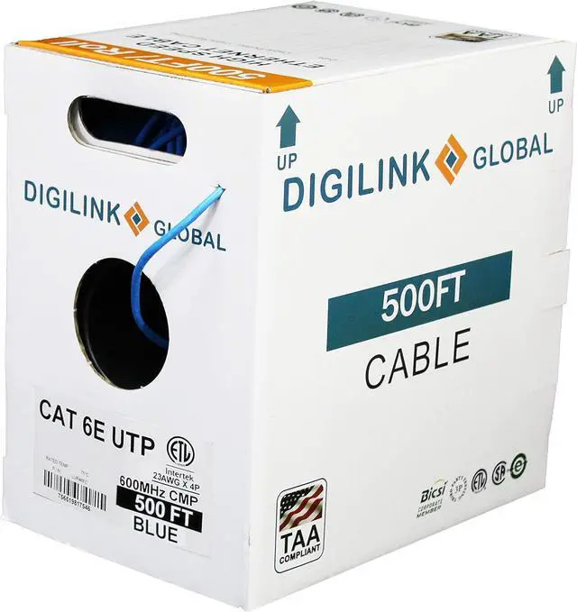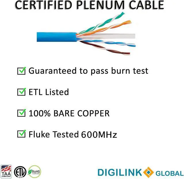 Digilink Global offers reliable high end solid bare copper cable for high speed Ethernet. Future proof your network with CAT 6E 600MHz, 10Gigabit Speed. Digilink CAT6E cables are made of 100% pure bare copper, which complies with UL Code 444 and ETL Standards. Solid bare copper also provides better flexibility and performance than copper clad aluminum. Features: Unshielded Twisted Pair (UTP) Category 6E Ethernet cable 23AWG, solid pure bare copper conductors CMP (Plenum) fire safety rating 600MHz bandwidth 500 foot roll Spline separator Plenum (CMP) Rated cables are installed in plenum areas, typically spaces between the structural floor or a dropped ceiling are considered plenum .