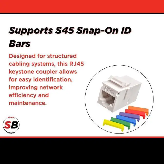 The video showcases the product in use.The video guides you through product setup.The video compares multiple products.The video shows the product being unpacked. Merchant Video This Simply45 Cat6 Unshielded & Shielded Keystone Feed-Thru Coupler ensures reliable, high-speed Ethernet connectivity for Cat6, Cat5e, and Cat5 cables. Designed for standard patch panels, wall plates, and surface mount boxes, it meets ANSI/TIA 568.2-D and ISO/IEC 11801 Class E standards. Ideal for home and office use, the supports Snap-On ID Bars for easy labeling and delivers strong signal integrity for structured cabling systems.