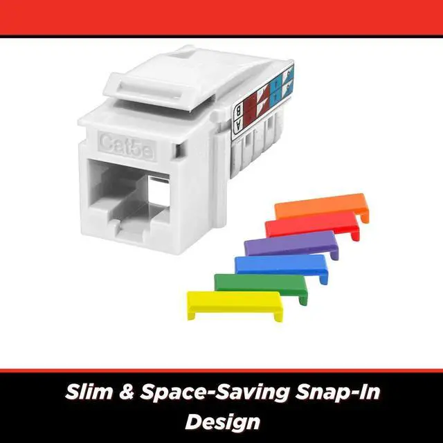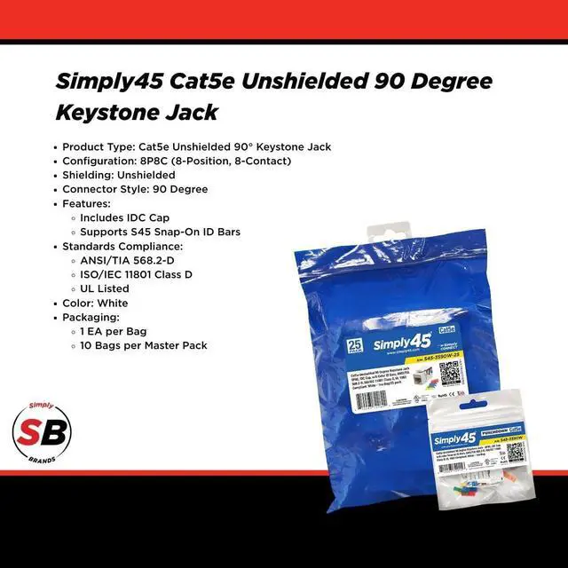 The video showcases the product in use.The video guides you through product setup.The video compares multiple products.The video shows the product being unpacked. Merchant Video The Simply45 Unshielded 90° Keystone Jack delivers reliable Cat5e UTP connectivity with a durable punch-down design, supporting 568A/B wiring and high-density installations. UL-listed and compliant with ANSI/TIA-568.2-D and ISO/IEC 11801 Class D standards, it fits standard keystone setups and is compatible with S45 Snap-On ID Bars, perfect for professional and home networks.