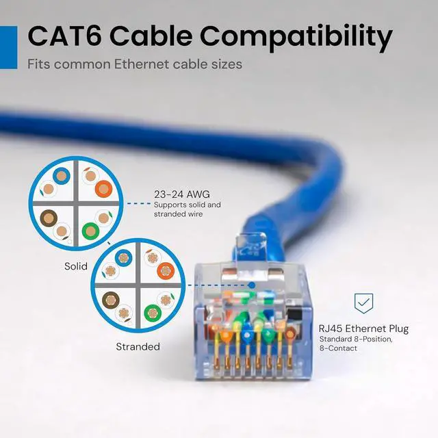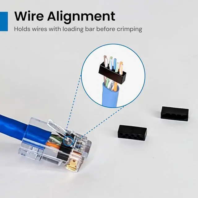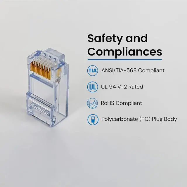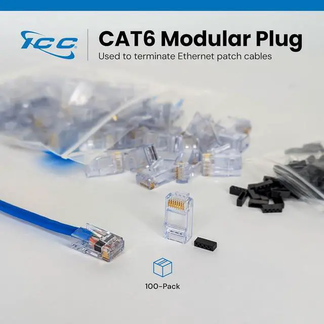 ICC CAT6 RJ-45 modular plugs feature a one-piece plug design with a separate loading bar to support faster and more consistent cable assembly. Designed for CAT6 UTP Ethernet terminations, these 8-position, 8-conductor modular plugs are compatible with both solid and stranded copper cable and accept 2423 AWG conductors. The loading bar helps align individual conductors prior to crimping, supporting accurate terminations when used with standard modular plug crimp tools. UL recognized and RoHS compliant, these CAT6 modular plugs are supplied in a pack of 100 to support batch terminations, maintenance, and ongoing installation needs.