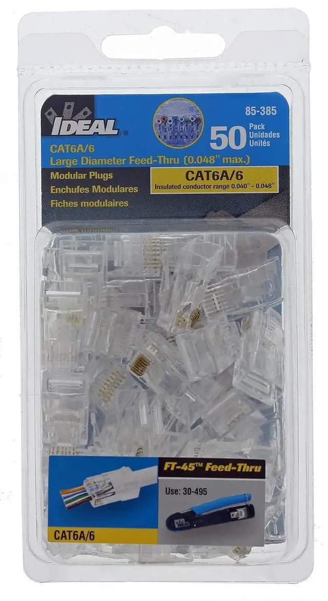 IDEAL Electrical 85-385 Unshielded Feed-Thru Modular Plug, Cable Connector for CAT6A/6 Unshielded Cables, 50 Connectors