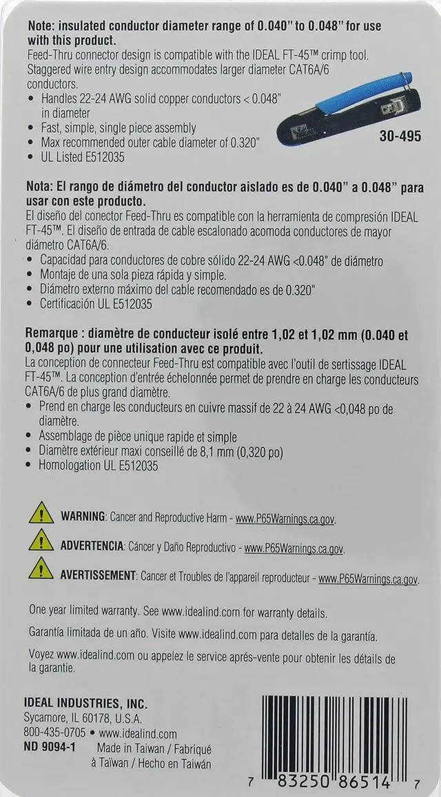 • TERMINATION: This Feed-Thru style connector should be crimped with the 30-495 FT-45 tool for best results.