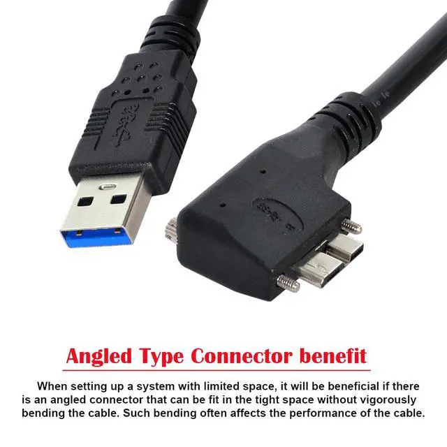 90 Degree right Angled Micro USB Dual Screws Mount to 3.0 Data Cable for Industrial Camera Our newest design in USB 3.0 cables. A cable built specifically for photographers using a new camera. This cable angles giving you that natural feel when shooting tethered. It feels great, and works fantastic. In preparation for release of this item, we had several photographers test it out on their systems, and all came back with excellent reviews on it.