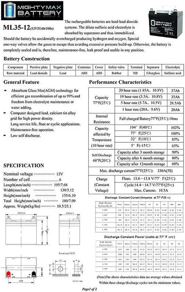 *****ML35-12 SLA is a 12V 35AH Sealed Lead Acid (SLA) rechargeable maintenance free battery*****