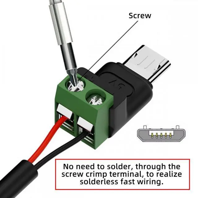 Micro USB to 2Pin Crimp Terminal Fast Charge Solderless Adapter, No need to solder, through the screw crimp terminal, to realize solderless fast wiring.