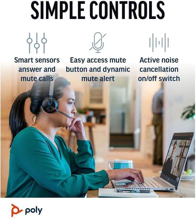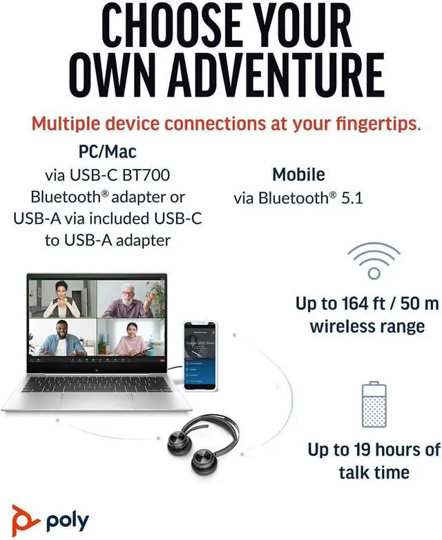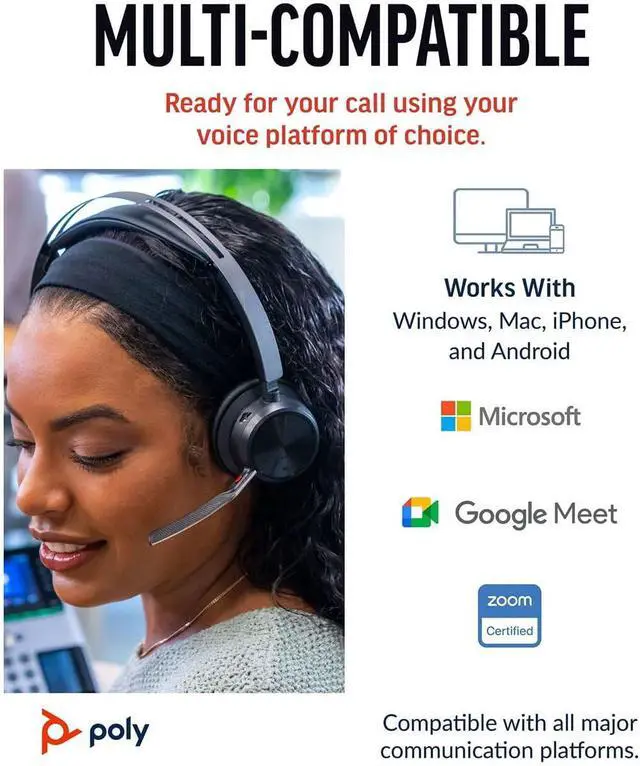 The sweet sound of focus Create a focus zone around you with the Voyager Focus 2, stereo Bluetooth® headset. Smartly engineered for audio perfection - all you will hear is your call. And the focus stays on you, right where it belongs.Your focus zone Experience Poly acoustic excellence with the Voyager Focus 2 headset. Loud and distracting background is reduced with three levels of advanced digital hybrid ANC. You'll be ready to have the most critical conversations with confidence.Wear it like it's not there Stay engaged during a full day of calls wearing a comfortable headband with cushioned sling and plush ear cushions. The Voyager Focus 2 is designed with you in mind - stay focused and productive all day.Crystal clear conversations It's you - loud and clear. That's all callers hear. The discreet microphone boom is not only ultra-noise canceling but, with its Acoustic Fence technology, literally creates a virtual noise-free bubble in front of your mouth.Feature | Immersive experienceStay focused while on calls or listening to music/media with stereo sound.Easy to use An easy-to-use headset with smart sensors for answering/muting calls and playing/pausing music. The intelligent microphone boom automatically maintains left and right audio no matter which side the headset is worn on.It's your call Stay productive with up to 19 hours of wireless talk time (ANC on) and extend the battery life by using it corded, with audio over USB mode.Choose your device Works with your choice of device: PC via included BT700 USB Type-C® Bluetooth® dongle and mobile phones via Bluetooth®.Connectivity options Enhanced connectivity for your devices with a USB Type-C® charging cord and tethered USB-A adapter.Smart sensors Dynamic Mute Alert senses and tells you when talking while muted. And the on-ear indicator light ?ashes to let others around you know you are on a call