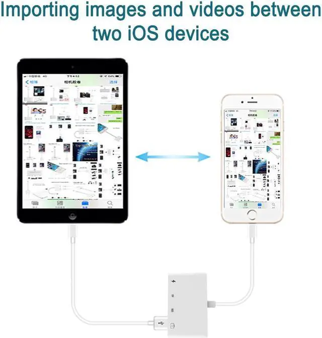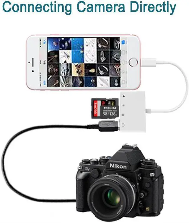 You can insert SD Card to this adapter,thce you plug in this adapter, your Phone / Pad will automatically,open the photo app, allowing you to select the photo you want to import and transfer the selected photo to your phone's album.