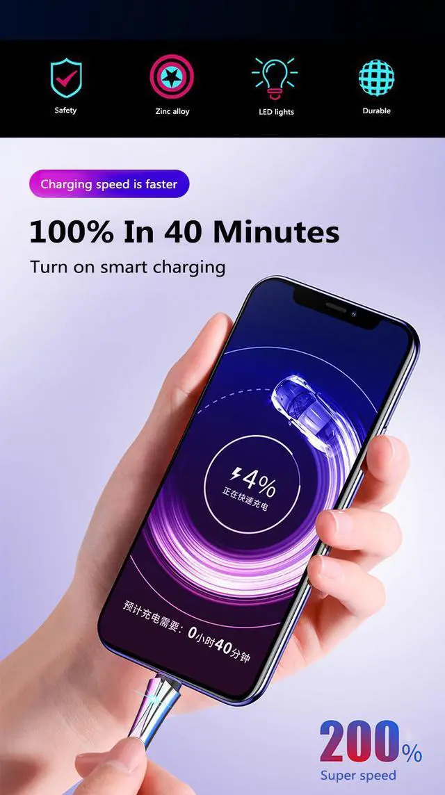 Premium thickened copper wiring to guarantee fast charging and transfer.