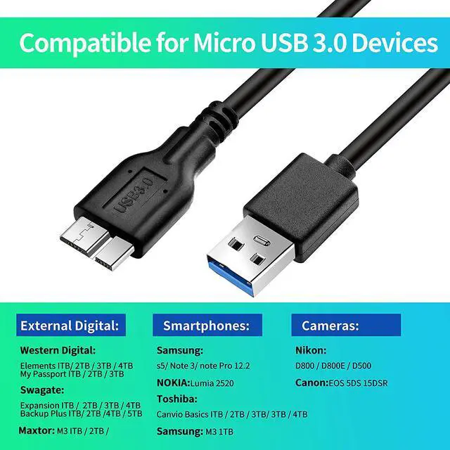 Charging Speed: Full copper super speed USB 3.0 A to micro B cable is designed to connect devices with micro USB 3.0 such as external hard drives, printers, scanners and external DVD players to a USB 3.0 compatible PC or laptop, with data transfer rates at 10 times the speed of USB 2.0. It offers a durable, high quality connection with the full capability of the USB 3.0 standard which is backwards compatible to USB 2.0 and USB 1.1.