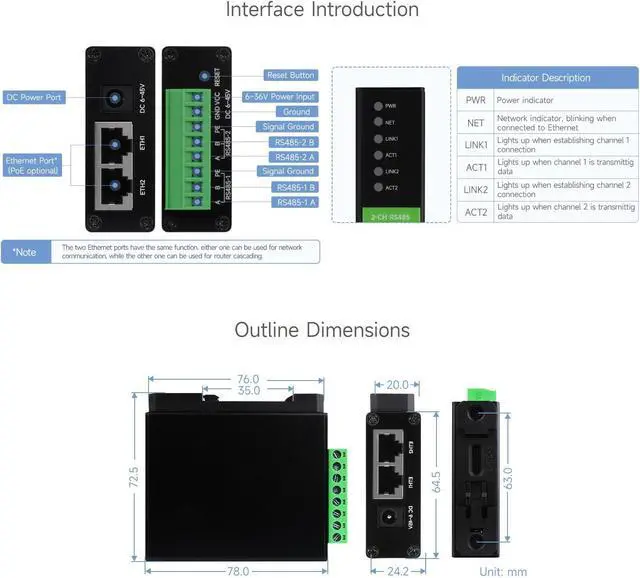 2-Ch RS485 To RJ45 Ethernet Serial Server, Dual Channels RS485 Independent Operation, Dual Ethernet Ports,Rail-Mount Industrial Isolated Serial Module Features At A Glance