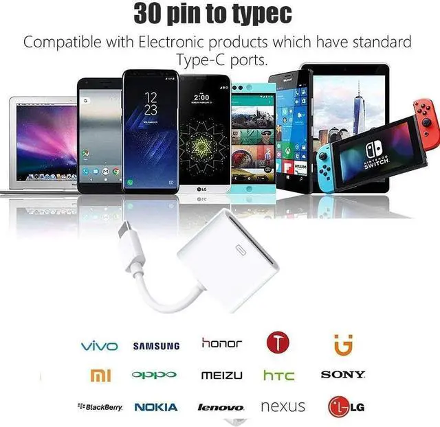 TYPE-C ADAPTER: This adapter features a 30-pin female connector and a USB 3.1 Type-C male connector on the other end. 30 Pin Female Adapter: Works only for Cell Phone & Tablets. Works with All Type-C USB cell phone and tablets.Ultra small size for easy carrying. It can connect a 30pin data cable to charge and transfer data to USB 3.1 type-C USB-c mobile phone. NOTE: This Adapter Only Support USB charge and Data, don't support audio, video. etc. The package includes: 1 piece USB C to 30-Pin adapter