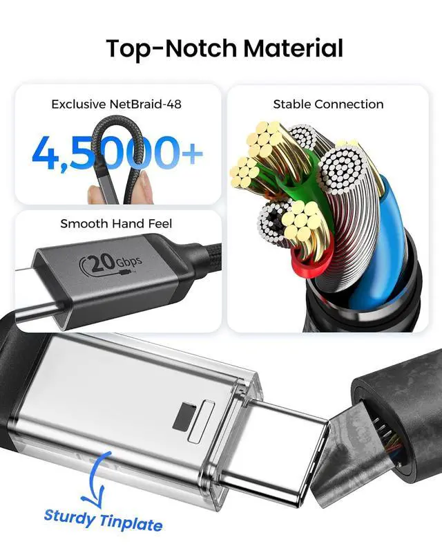 20Gbps Data Cable- USB C data cable provides ultra-fast sync with a maximum of 10Gbps and can backup 10GB files in seconds. Note: To achieve a transfer speed of 20Gbps, both ends of the cable must be connected to devices that comply with USB 3.1 or higher standards, such as USB 4 and Thunderbolt 4/3.