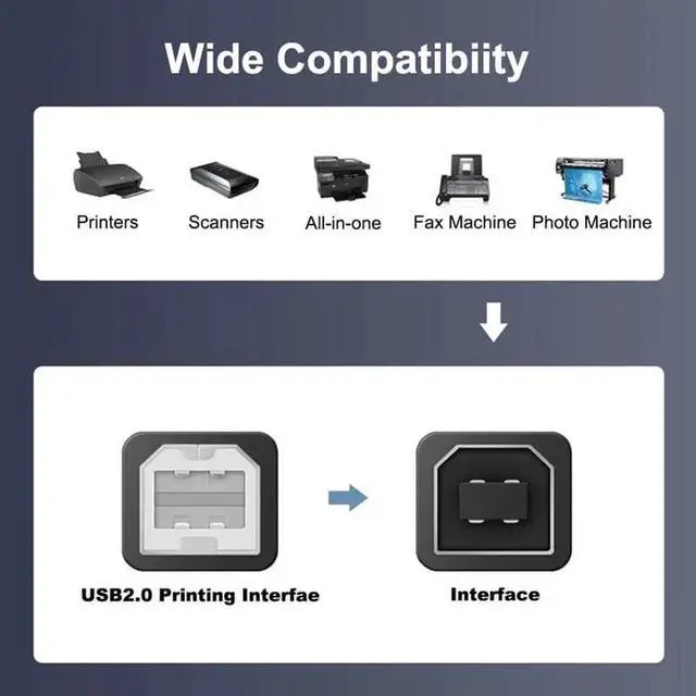 WIDE COMPATIBILITY: This printer cable is compatible with Epson XP-600 / XP-200 / WF-7710 / XP-225 / XP-425 / XP-446 / XP-440 / XP-630 / XP-310 / C88 +, Epson Workforce 545; HP Envy 5660/4520/5055, HP Deskjet 3050/1112, HP Photosmart 5520/7520 / C4750, HP 8600 office pro / HP Laserjet Pro M118DW /, Brother MFC L-27000W, Brother HL-L2300D, MC8000 MIDI controller, Bluetooth Cannon MX492, Akai USB EWI, MIDI controller and MIDI keyboard with USB 2.0 B