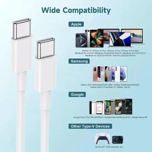 Wide Compatibility: This is the USB-C to USB-C cable not the USB-C to USB-A cable, which is compatible with almost all USB-C devices, including phones, tablets and laptops. For example, compatible with Samsung Galaxy S21/ S21+/ S21 Ultra/ S20/ S20+/ S20 Ultra/ Note 20/ Note 20 Ultra/Note 10/ Note 10 Plus/ A80, Google Pixel 2/2XL/3/3XL/3a/3aXL/4 /4 XL/ 5, Macbook Air/ 13, iPad Pro 2018/2020, iPad Air 2020 10.9" (Gen 4) with the original charger (View Product Description for details).