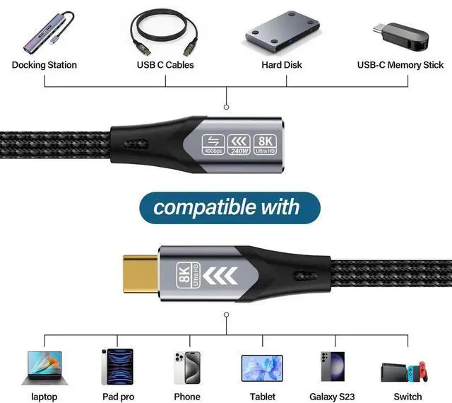 - Works with Everything Designed for universal compatibility, this USB-C male to female cable works seamlessly with Thunderbolt 4, Thunderbolt 3, and USB 3.2/3.1/3.0/2.0 devices. Its perfect for extending connections to laptops, smartphones, tablets, monitors, It also supports external SSDs, docking stations, eGPUs, VR headsets, and Type-C hubs, making it a versatile USB-C extension solution.