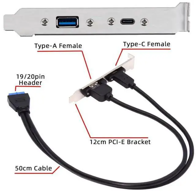 High Speed USB3.0 Motherboard 19/20Pin to USB-C Type-C & USB 3.0 Dual Ports Female PCI-E Back Panel 5Gbps Cable 50cm