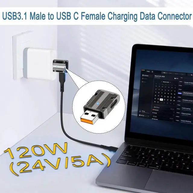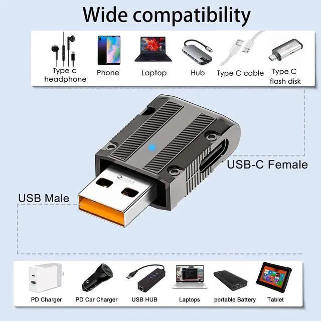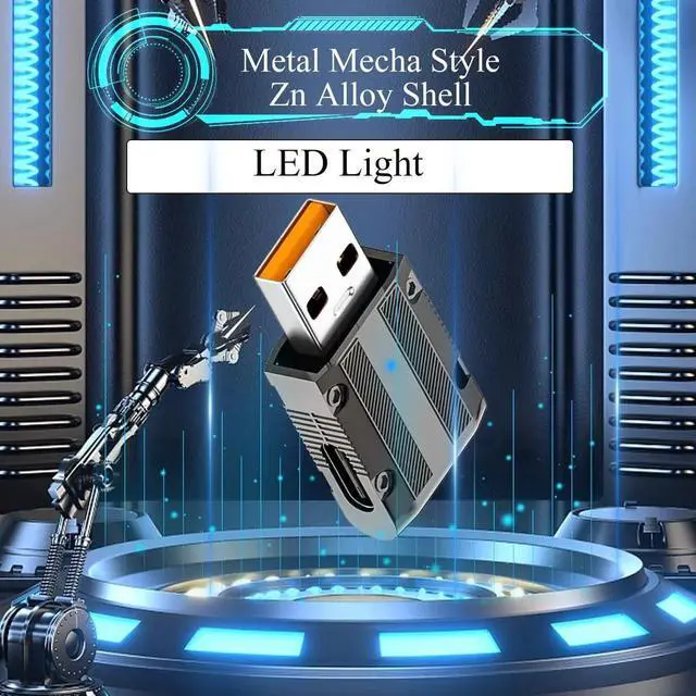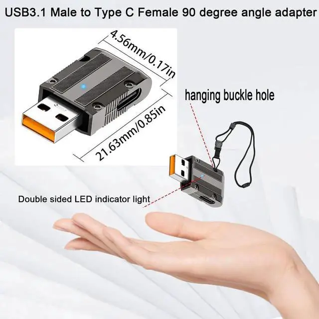 10Gbps 120W Metal Mecha Style USB3.1 Male to USB C Female 90 degree angle Connector. Metal mecha style, craft level art texture. Perfect as a gift for friends or family.USB3.1 Gen 2 male input, USB C female output, allows PC, laptop, game console, wall charger, easy to external Tpye port gamepad, headset, mouse, keyboard, HUB and so on. Overall straight design, USB C female port is 90 degrees to the left layout, easy to route in tight spaces. Zinc alloy shell, sturdy and durable.Double sided LED indicator light, light up when working. With hidden hanging buckle hole, easy to carry, not easy to lose.
