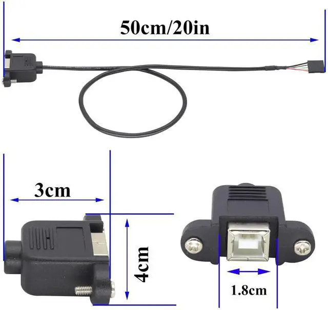 Cable length: 50cm High speed 2.0 USB Extension Lead This USB cable connects rear USB female port to front panel I/O header The cable exits through the PCI opening and plugged into one of the USB ports located at the back of the PC You can also connect this cable to the internal port (USB type B female) of PCI USB card, or USB firewire combo card. 1x5 pin female usb header connector with 1"/2.54mm pitch It's compatible with both USB 1.1 (standard) and USB 2.0 (high-speed). Suitable for extending any USB device Package included: 1 piece x 50CM USB 2.0 B male plug to 1x 5Pin Female 0.1" USB header PCB motherboard cable