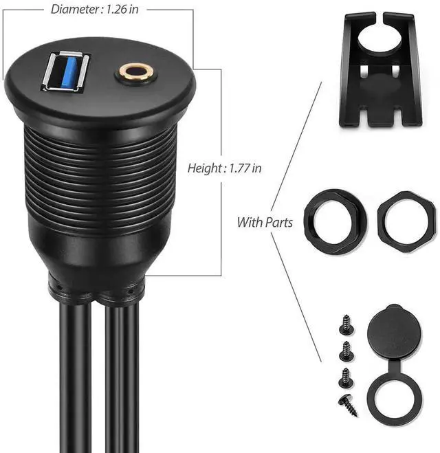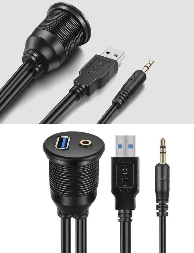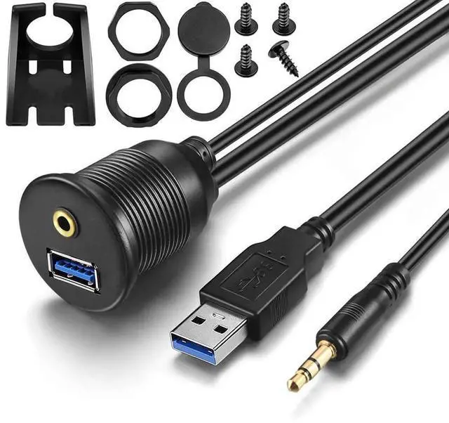 GOLD PLATED 3.5MM MALE to 3.5MM FEMALE and USB 3.0 MALE to USB 3.0 FEMALE FLUSH MOUNT EXTENSION CABLE, this could be used in car, marine, bike or motorcycle. Accessories such as bracket, flush mount components, screws & lid are included for the installation in existing socket or new hole on dashboard.