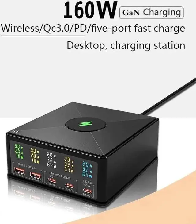 160 W USB C Fast Charger: 5 port usb c charger has 3USB-C 65W+2USB-A 22.5W + Wireless 15W. 3