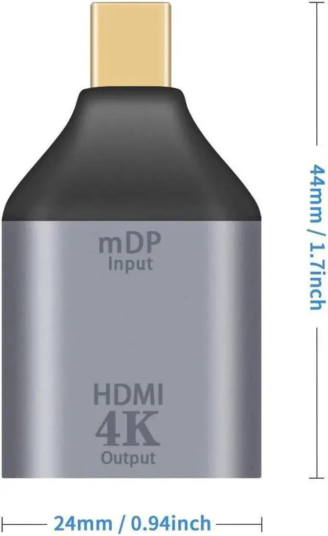 HDMI Adapter: with portable design is easy to tuck into your bag or pocket to use your laptop and projector or extend your desktop screen to a monitor or TV. Mini DisplayPort male to HDMI female converter supports resolutions up to 4k (3840*2160) @30Hz including 1920x1080@60Hz (1080p Full HD) 720p 1600x1200 1280x1024 for high definition monitors or projectors.