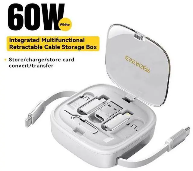 Essager 60W USB-C to USB-C Retractable Cable with Micro USB & Lightning Adapters, PD Fast Charging Cord with Storage Box, Multi-Function Data Transfer & SIM Card Holder Kit white