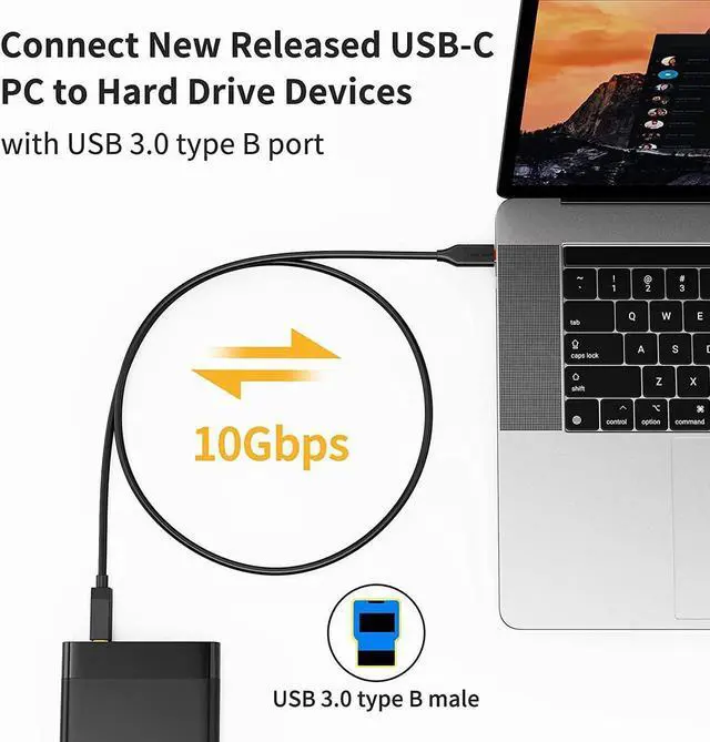 10Gbps Super SpeedGEN2 USB 3.1 Type C to USB B cable, data transfer speed up to 10Gbt/s. USB Type-C to USB 3.0 B male cable with sturdy construction, fully shielded cable provides superior transmission performance; Gold plated connector, reduce signal loss and 100% contact efficiency.