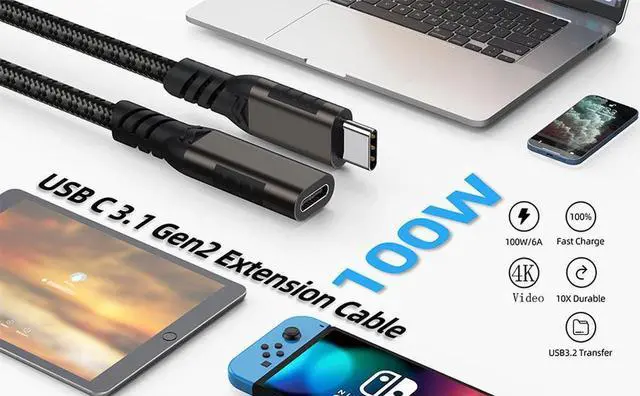 USB C 100W Extension Cable, USB 3.1 Type C PD 10Gbps Male to Female Extender Support QC 3.0 Fast Charge and 4K@60Hz Video Sync