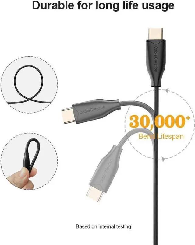 Soft & Flexible PVC usb-c to c cable covered with PVC molded jacket, softer and more flexible than most usb c cables in the market. Besides, this usb c to c cable can bear 30000+ bending test, more durable for long life usage.