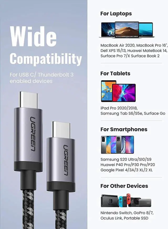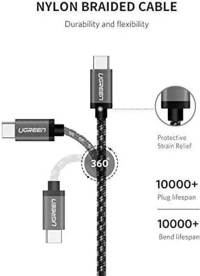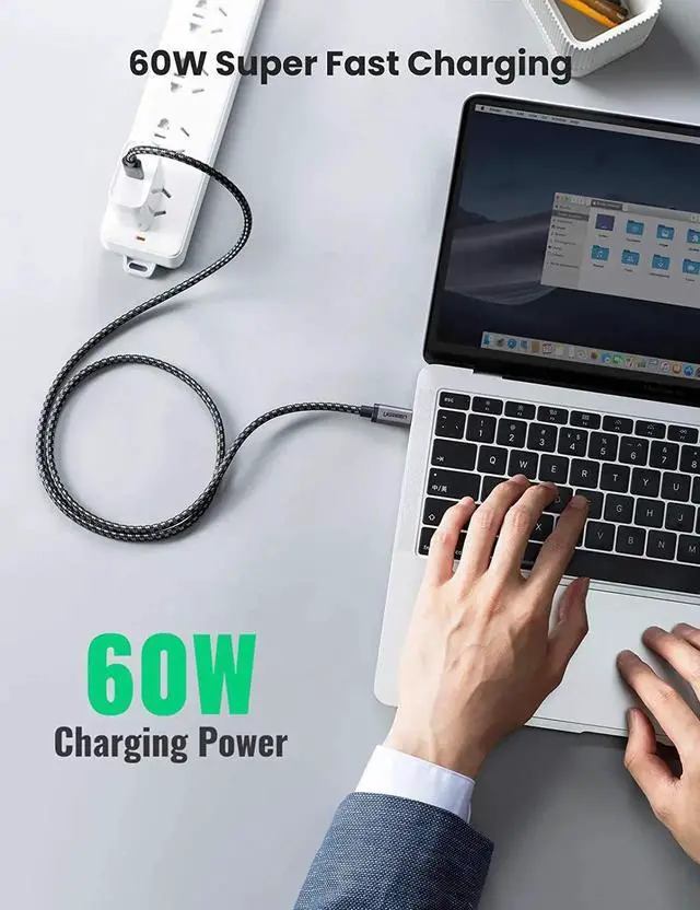 PD Charging: UGREEN USB C Cable 3.1 Fast Charger offers faster and safer charging for USB Type-C laptops or cell phones at Max 20V 3A. It supports 60W Power Delivery charge also known as PD charging protocol.