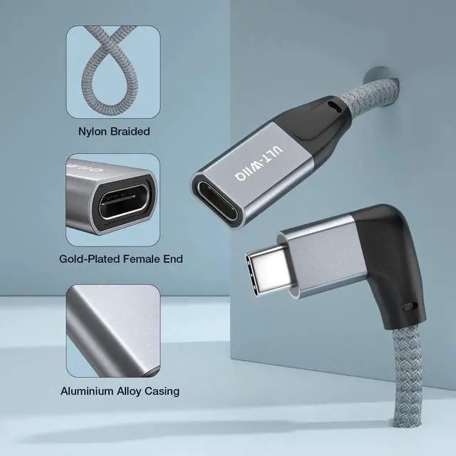 90 Degree USB-C 3.1 Extension Cable The ULT-WIIQ 90 Degree USB C extension cable is used to extend the use distance of the Male to Female USB-C 3.1 interface for charging or data syncing, The special 90° connector design makes for better cable management in some situations, especially in tight spaces like cars, corners, play game, etc. Also, the right-angle plug makes a nicer fit in your hand without breaking.