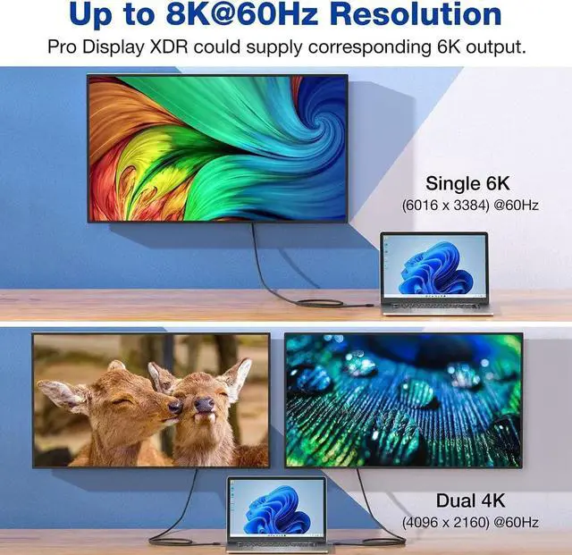 Up to 8K HD Video USB4, which supports efficiency sharing, does not waste any bandwidth when sending multiple signals through the cable, allowing you to share Ultra HD content between multi screens without compromising quality. This USB4 cable features enough bandwidth to drive one 8K@60Hz/6K@60Hz display or two 4K@60Hz displays. Enjoy Apple Pro Display XDR for crystal-clear 6K video experience.