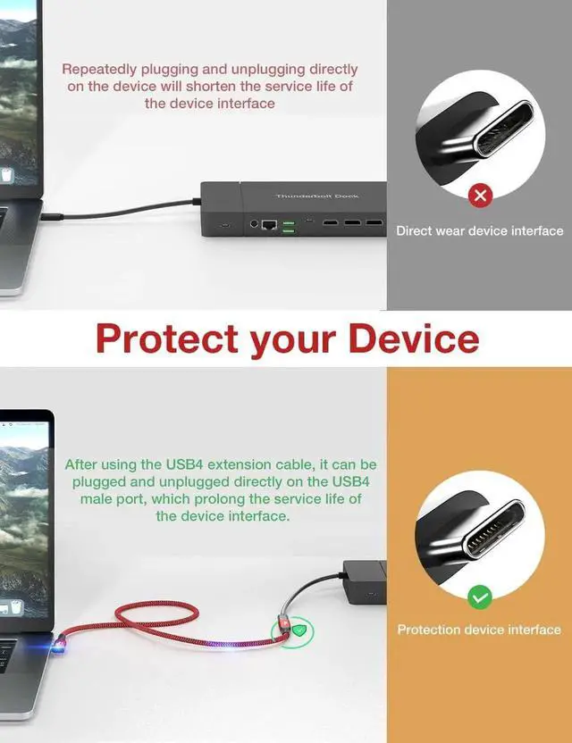 Exclusive 90 Degree USB4 Extender The USB4 extension cable is fully compliant with USB4 specifications that can support all USB C devices. The special 90° connector design is perfect for your Thunderbolt Laptop, Thunderbolt 3 monitor near the wall, or any Thunderbolt 3 & 4 cables in tight spaces, preventing scratches on the surface of Thunderbolt 3 & 4 docking stations.
