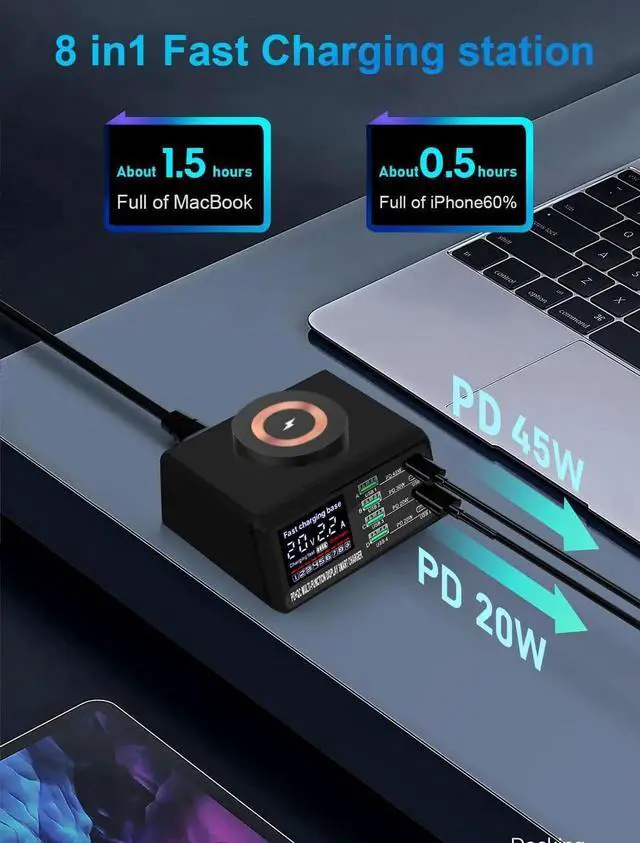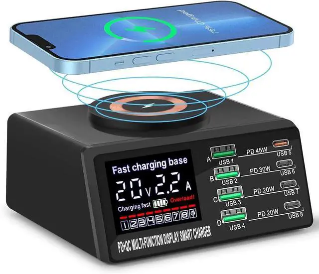 WIRELESS AND SCREEN DISPLAY USB CHARGING STATION --- The charging station includes wireless charging capability and a screen display for monitoring. This multi charging station keeps all your devices powered and organized, Making it one of the best chargers for multiple devices
