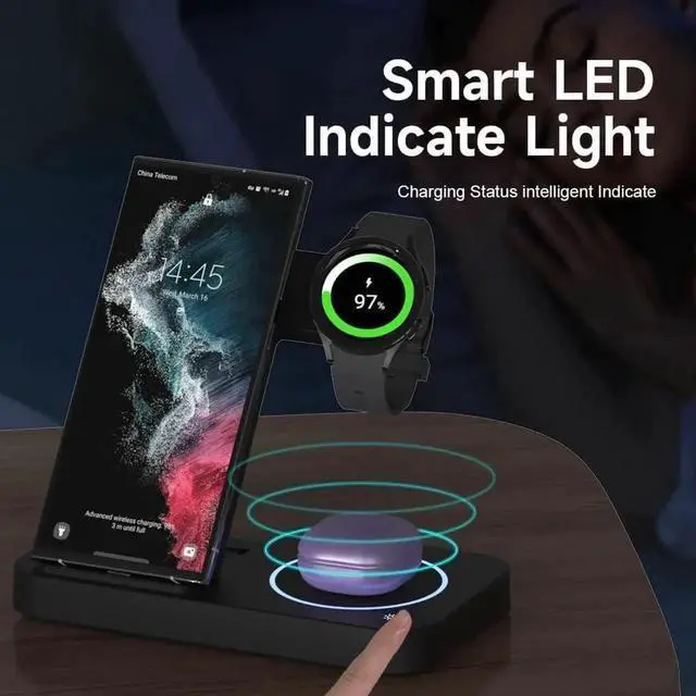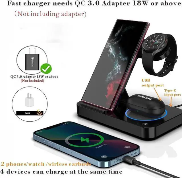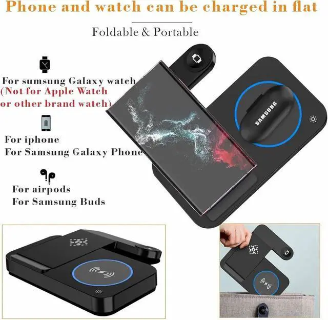 3 in 1 Wireless Charger --- 15W Fast wireless charging station compatible with samsung Galaxy S25 Ultra/S25/S25 Plus/S24 Ultra/S24/S24 Plus/S23 Ultra/S23 Plus/S23/S22/S21/S20/S10/Note 20/Z Flip 6 5 4 3 2 1/Z Fold 1 2 3 4 5 6/iPhone 16e/16/16 pro/16 pro max/16 plus/15/15 pro/15 plus/15 pro max/14/14 pro max/14 plus/14 pro/13/12/11/XS MAX/XR/X/8/ 5W wireless charger for Galaxy Buds 2 Pro/2/Pro/plus/Live. Compatible For AirPods 2/3/Pro/Pro 2 and other wireless earbuds. 2W magnet wireless charging dock For Galaxy Watch Ultra/7/6/5 pro/5/4/4 classic/3/Active/Active 2 (Not for Samsung Gear S4/S3/S2/S) (Not for Apple Watch or other brand watch)