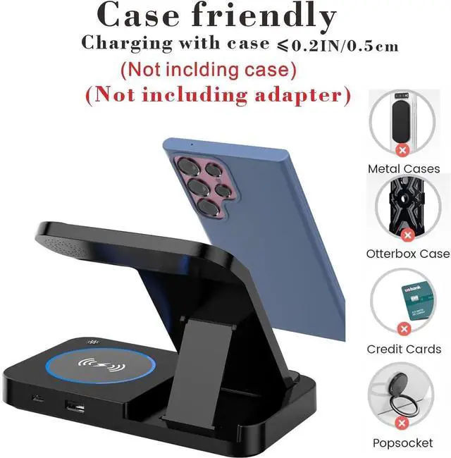 Anti-Slip And Case Friendly --- Anti-slip Silicone Pads Protect Your Devices From Sliding Off. Our Phone Charger Stand Can Charges Directly Through Phone Protective Cases 0.2 In, Saves The Trouble To Remove Phone Case While Charging. A Best Cellphone Accessory For Your Desktop And Bedside, Now Right To Simplify Your Life Space! (Note: Remove The Magnetic Or Metal Accessories From The Phone Case When Charging. )