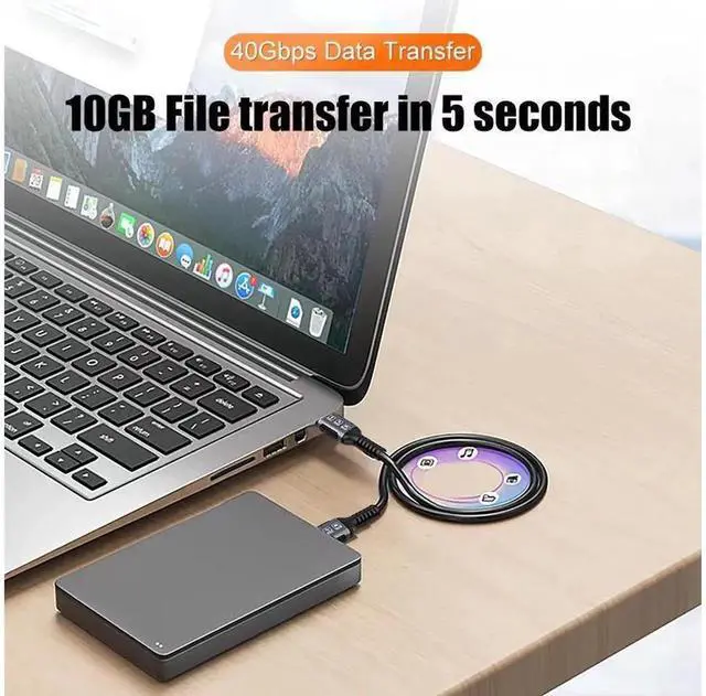 Fast moving Files: The theoretical maximum transmission speed of our 240W USB4 data cable is 40Gbps, which means that 2.5G files can be transferred in 1 second (The real transmission speed up to 2.8GB /s Read and 2.1GB /s Write), and just plug and play freely.