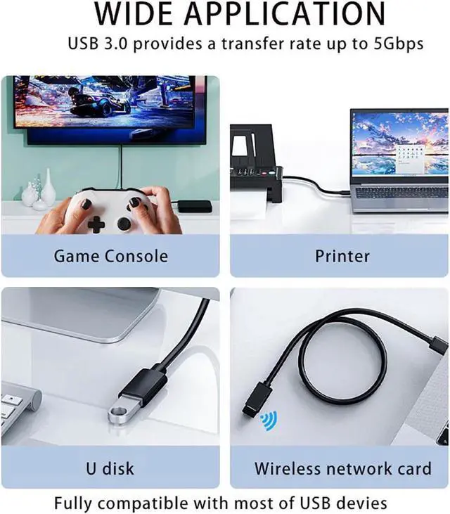 Compatible with Mouse, keyboard, PC, laptop, tablet, Macbook, TV, USB hub, printer, scanner, and camera.