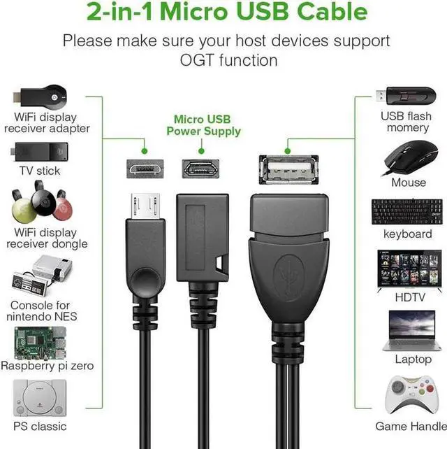 2-in-1 OTG adapter allows your host devices to add on any USB peripherals such as keyboards, mice, USB Hub, flash drives, external hard drives, USB card readers, game controllers, or whatever.