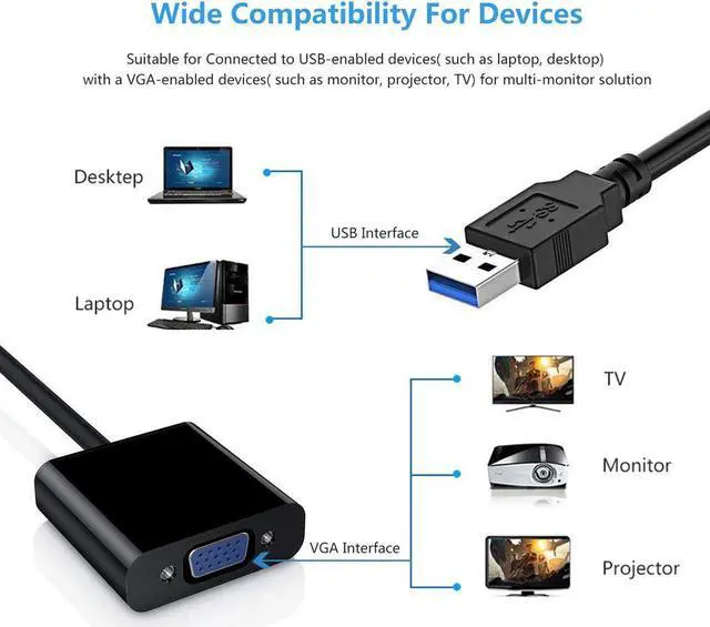 This USB 3.0 to VGA Adapter is used to connected a USB-enabled devices( such as laptop, desktop) with a VGA-enabled devices( such as monitor, projector, TV) for multi-monitor solution, extending working space with split-screen, mirroring display, etc.