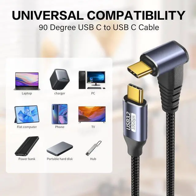 90 Degree Angled Type-C USB-C Male to Male USB 3.1 10Gbps 100W Data Cable for Laptop Phone
