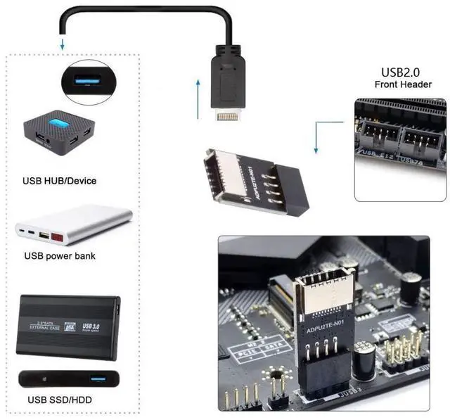 4) The compact adapter can be inserted directly and requires no additional attachments.Converter plug-in for the mainboard, Fits into any USB 2.0 header.