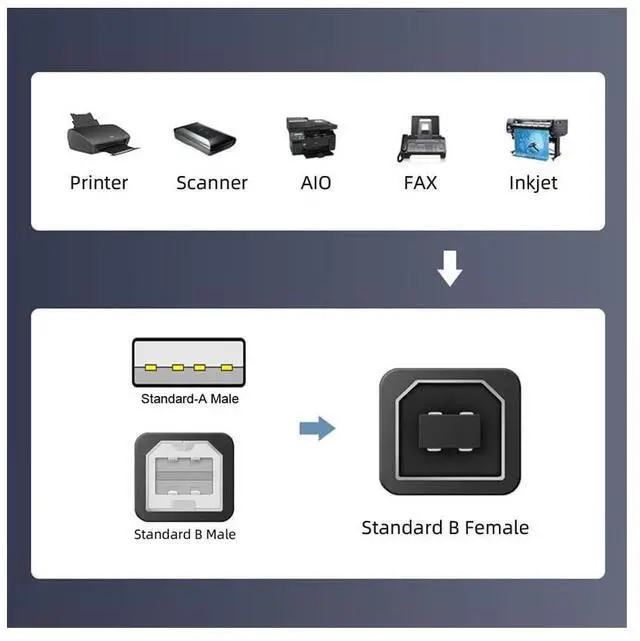 USB 2.0 Printer Cable Provides a high speed of 480 Mbps, standard 2.0 connector provides excellent electrical conductivity, and high-speed transmission data is fast and accurate.