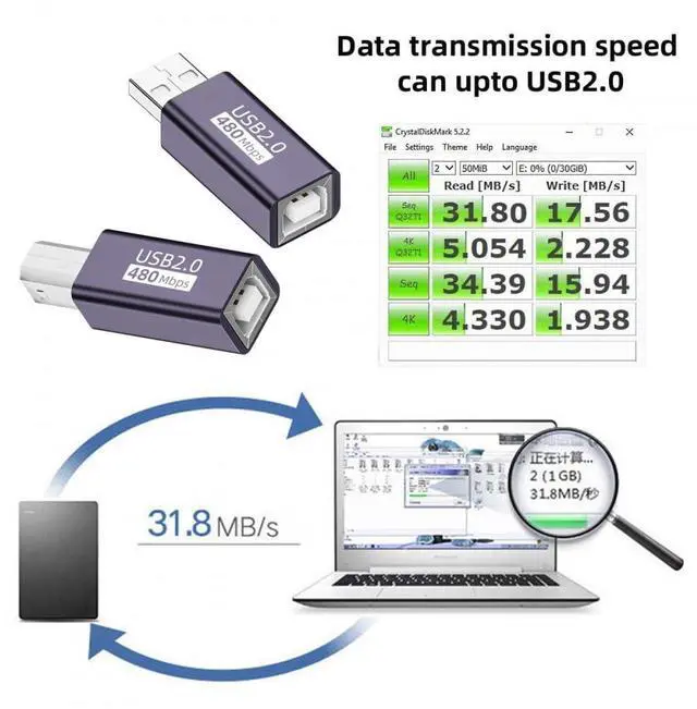 The package included 2pcs adapter. One Side is Female USB B Type,The Other Side is USB B male or A male.