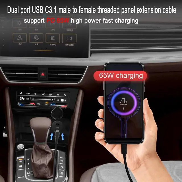 2 USB C car threaded flush panel mount cable, data transfer speed up to 10Gbps, support 4K@60Hz audio and video transmission, support PD 65W high power fast charging, suitable for extending the USB C ports of dashboards and electronic devices in cars, trucks, motorcycles, boats, yachts, etc.